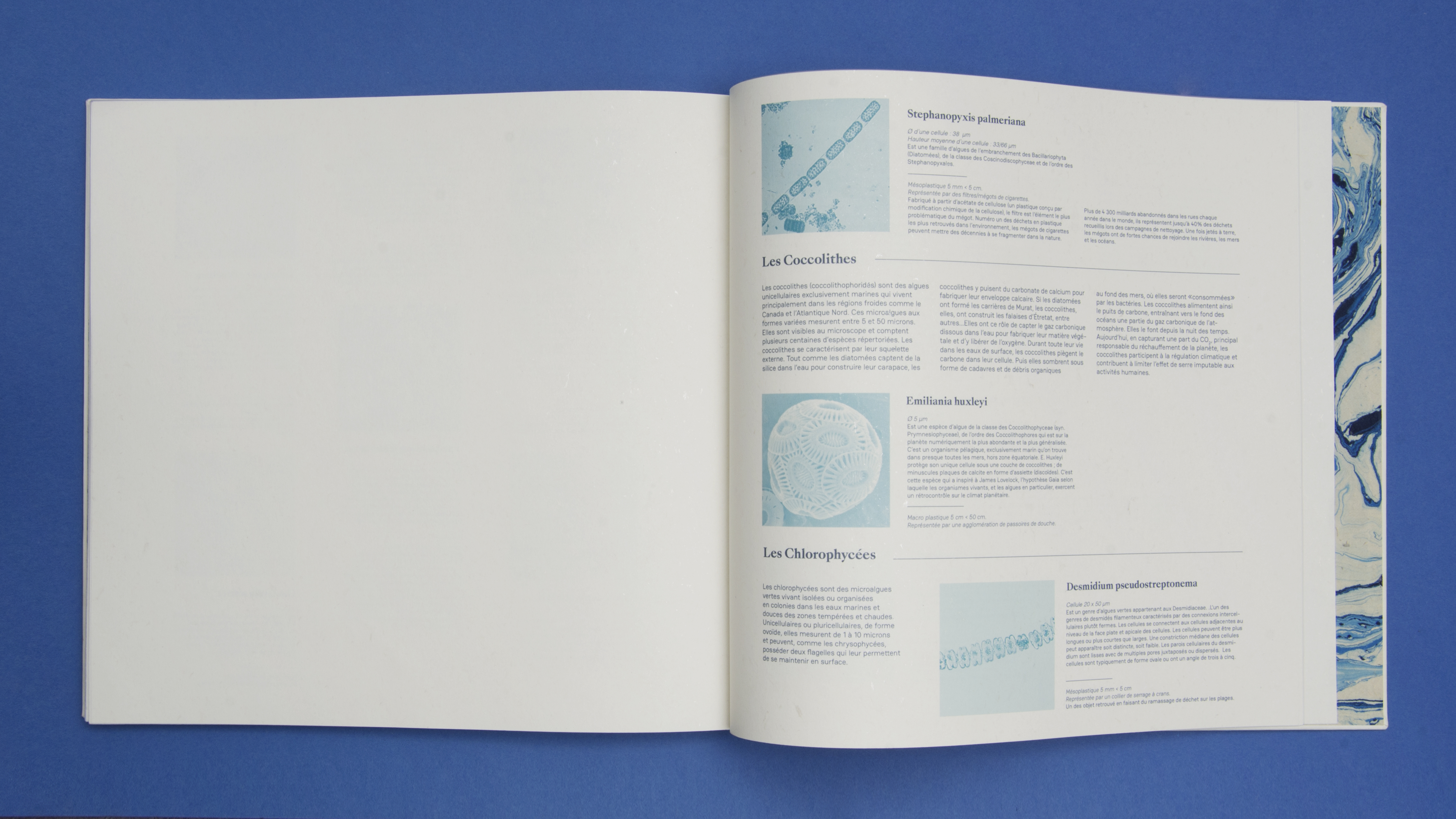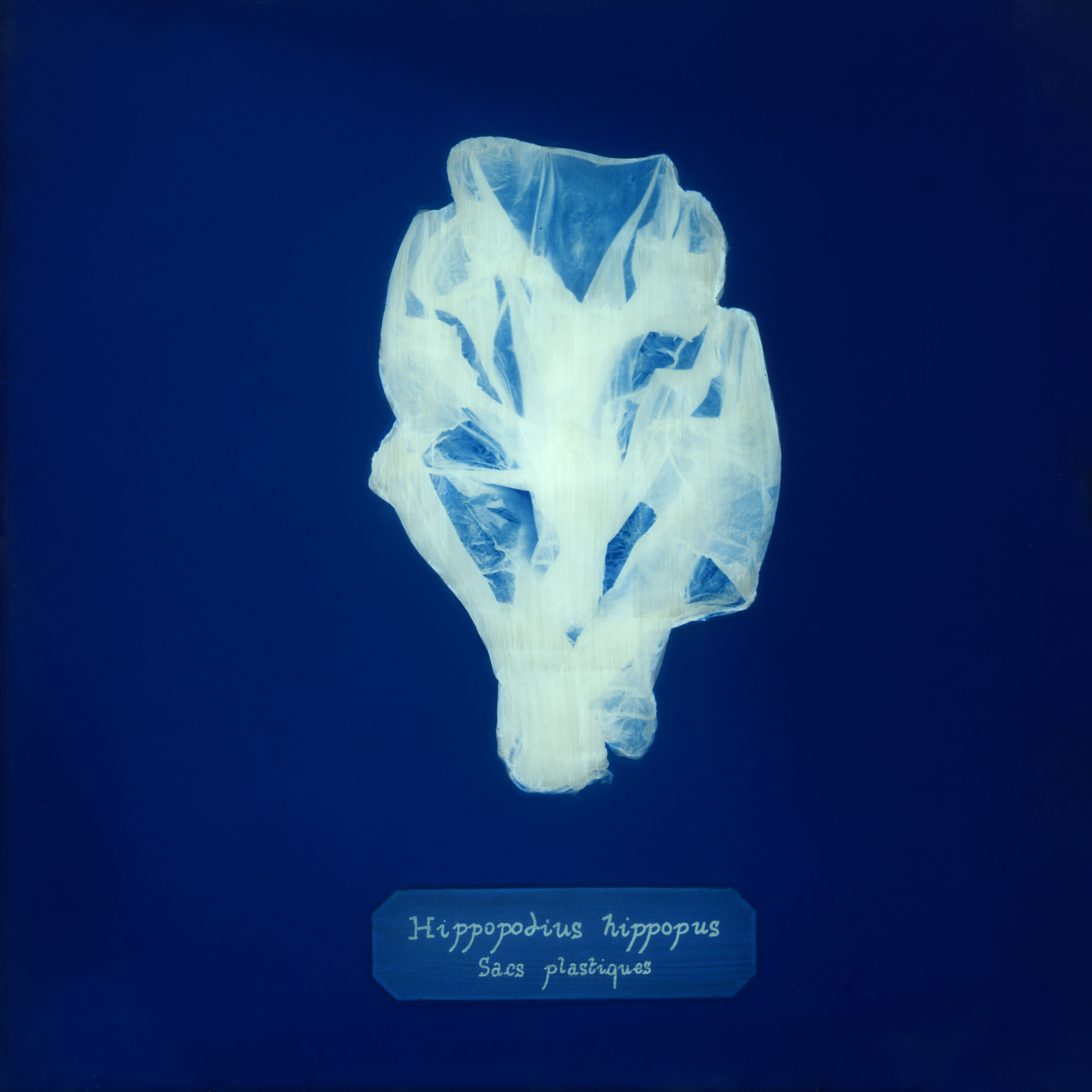 With the creative image, I offer a new form to the destroyed world of tomorrow by reinventing its structure: plastic materials become the new representative form of microbiomes and plankton. Through the game of mimesis, I replace the real and anticipate a future through a projective image. Plastic waste, recovered from beaches and bins, allows me to reproduce these underwater species using a scientific and documentary approach, frontally on a cyanotype background. Inspired by Anna Atkins’ British Algae herbarium, or Ernst Haeckel’s sublime plates on The Artistic Forms of Nature, these productions are a dialectical tension between the sublime and the derisory of a nature damaged by the hand of man.